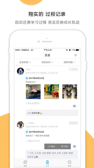 自动还原学习过程,真实反应成长轨迹:通过时间轴形式直观展示学生的研学历程