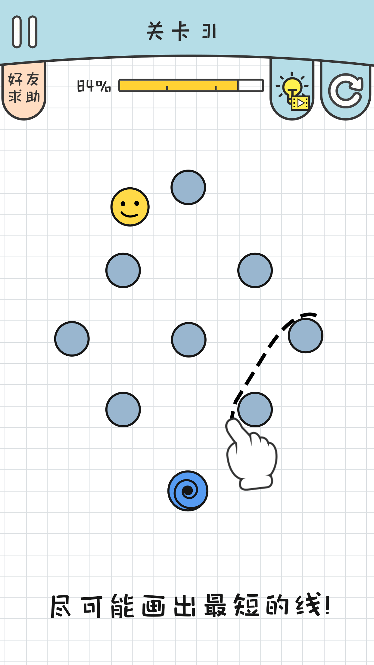4.画的线越短越好:游戏设有线条长度评级系统,用最精简的方案通关可获得三星评价,激发玩家不断优化解决方案的动力,排行榜功能可查看全球玩家的最短方案