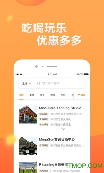 2、精选上千家优质商户优惠,包含星巴克买1送1、美食5折、购物满减、加油8折、1元停车等超值福利