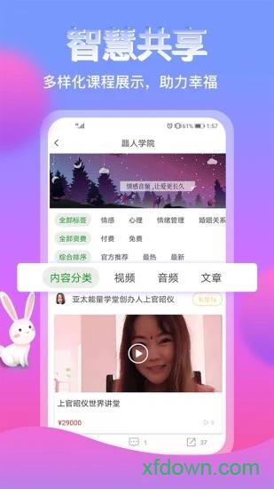 【心理课程】无论你是心理学爱好者,还是存在婚姻、情感、亲子等方面的困扰,在这里,都有丰富专业的课程,给你指点迷津。课程内容涵盖情绪管理、亲密关系、亲子沟通等多个方面,由知名心理学专家主讲,采用音频、视频等多种形式,让您随时随地都能学习心理健康知识。