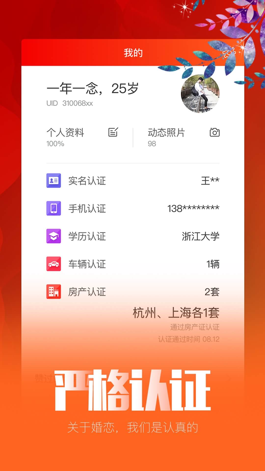 1、全新机制。每位用户都是经过实名身份认证后才展示出来,身份、学历、车辆和房产认证,人工审核保证真人真照片真背景,平台杜绝各种爱情骗子和广告、不良用户。通过实名认证、资产认证的方式彻底的和探探、陌陌等不严肃的交友平台区分开。2.首页:直接查看会员的真实头像及信息,根据个人要求进行筛选在合适时间找到合适的人,喜欢的人可以直接收藏让对方知道你的心意。3、消息:希望认识的会员可以直接给对方发送消息进行聊天沟通。4、我的:个人详细信息的真实,会员信息都是经过严格的审核,可以迅速真实的了解会员的个人情况。平台还新增了语音聊天和视频通话功能,让沟通更加便捷高效,进一步拉近您与心仪对象的距离。