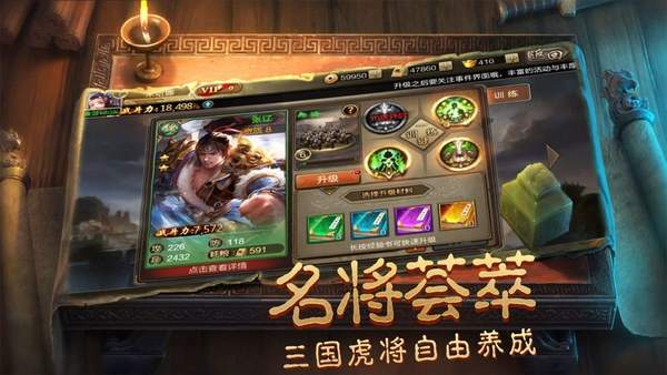 2、自由培养强力武将,通过不断的训练和战斗杀敌来提升实力。武将培养系统包含等级、星级、缘分等多维度成长体系。玩家可以通过"演武场"训练武将,或派遣他们执行特殊任务来解锁隐藏剧情。