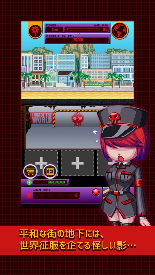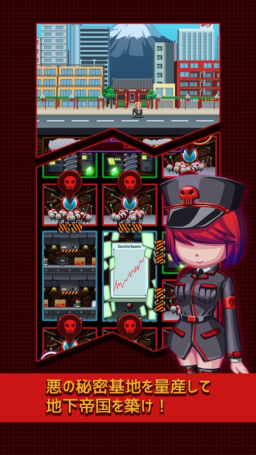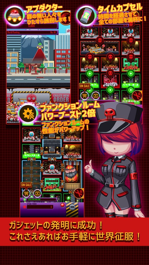 《世界征服株式会社》将经典日式反派设定与放置玩法完美融合。游戏以看似平静的现代都市为舞台,玩家需要在地下300米处建立秘密基地。随着资源采集和科技研发,可以解锁包括生化改造人、机械战甲、哥斯拉级怪兽等超过20种特色兵种。每个被征服的国家都会成为新资源据点,全球版图将随着游戏进程逐步解锁。特别设计的"恐慌值"系统会实时反映地表世界的混乱程度,当电视新闻开始报道神秘事件时,就意味着你的邪恶计划正在奏效!