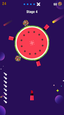 2、你要发射口红的时候一定不要碰到其他的口红哟,不然你会挑战失败,还有圆盘的速度会越来越快。游戏加入了碰撞惩罚机制,失误会扣除机会。