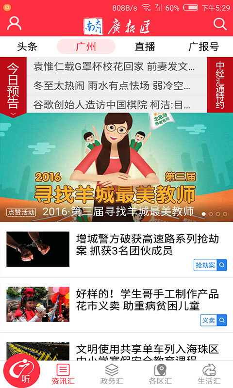 作为广州日报大洋网旗下的"智慧城市"应用,广报汇APP采用创新的W.A.W.T模式,集新闻资讯、便民服务于一体。广——26个特色栏目全方位覆盖城市生活,记者手机直播让您身临新闻现场,"市民议政厅"搭建起市民与政府沟通的桥梁。报——整合广州日报集团旗下所有媒体资源,包括广州日报、信息时报等优质内容,提供便捷的订报服务和新闻爆料功能。汇——宅之便商城让您足不出户就能享受购物乐趣,各类生活服务一键搞定,真正实现"一机在手,生活无忧"。