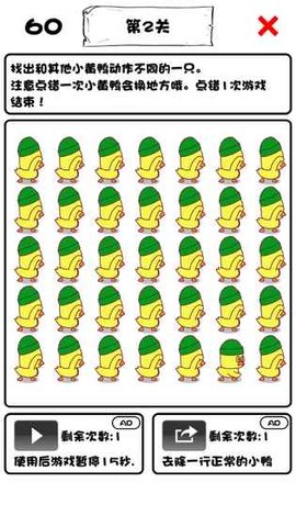《一起来找小黄鸭》是一款集休闲娱乐与益智挑战于一体的创新游戏。游戏采用清新明亮的画风,将经典的小黄鸭形象以各种生动有趣的姿态呈现。每个关卡都会呈现数十只动作整齐划一的小黄鸭,其中隐藏着一只动作特立独行的"异类"。玩家需要在限定时间内准确找出这只与众不同的小黄鸭。游戏初期关卡较为简单,适合所有年龄段的玩家上手体验;但随着进度深入,小黄鸭的数量会不断增加,动作变化也更加细微,为玩家带来极具挑战性的游戏体验。游戏还特别设计了多种难度模式,满足不同水平玩家的需求。