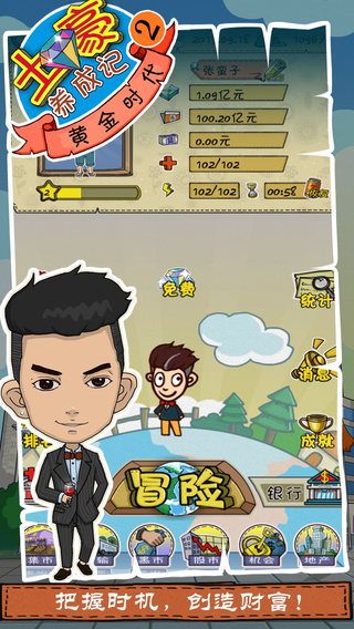 游戏提供了6个各具特色的初始角色供玩家选择,每个角色都拥有不同的背景故事和初始资源。四个发展阶段(乡村、县城、城市、都市)不仅场景风格迥异,更包含了数十种功能各异的经营场所,如传统集市、现代银行、医疗机构、证券交易所和房地产市场等。完善的成就系统设置了"百万富翁"、"股神"、"地产大亨"等数十个荣誉称号,记录着玩家在商业道路上的每一个重要里程碑。多样化的游戏内容和深度的经营策略,确保了每次游戏都能带来新鲜体验。