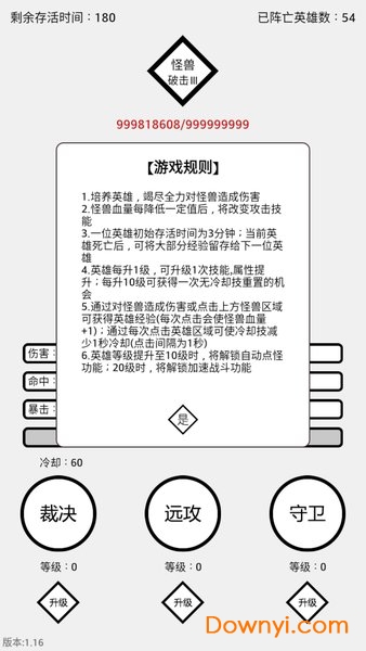 三分英雄安卓版是一款以极简文字风格呈现的休闲策略手游,游戏核心玩法充满挑战性——玩家需要指挥英雄在180秒的极限生存时间内对抗源源不断的怪兽。与传统RPG不同,本作采用独特的"经验传承"机制,即使英雄倒下,培养成果也能延续至下一位继承者。游戏体积仅几十MB却包含深度养成系统,英雄会随等级提升解锁自动战斗、加速模式等实用功能,而怪兽则会根据血量变化切换攻击模式,为简单的点击操作增添了策略维度。其清爽的界面设计与轻量化的操作体验,特别适合碎片时间游玩。