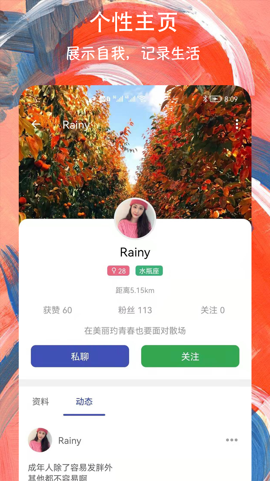 【同城交友】精准的LBS定位技术,可智能筛选3公里内的活跃用户。支持按职业、年龄、兴趣等多维度筛选,还能查看对方的日常动态和生活方式,找到真正契合的社交对象。