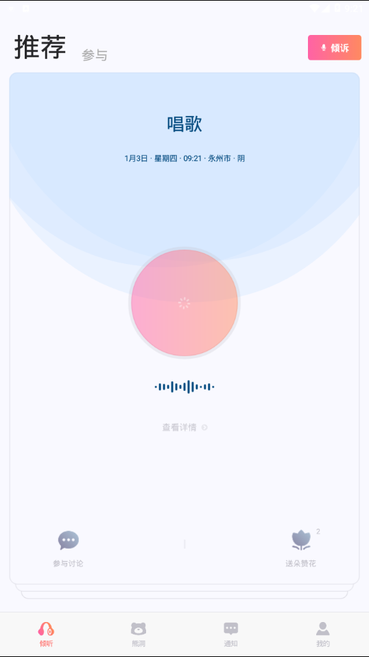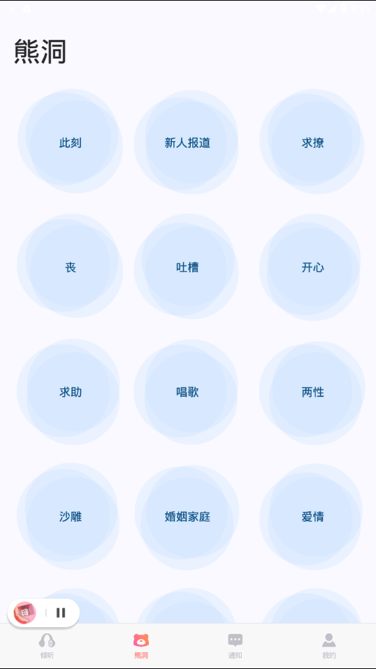 熊洞app是一个温暖而私密的在线倾诉平台,为用户打造了一个无压力、无烦恼的情感交流空间。在这里,你可以自由地分享生活中的喜怒哀乐,与陌生人建立真诚的沟通。平台通过独特的语音交互方式,让用户能够以最自然的状态表达内心,获得情感共鸣和心灵慰藉。无论是想要倾诉烦恼,还是寻找志同道合的朋友,熊洞都能为你提供一个安全、包容的交流环境,让每个声音都能被温柔以待。