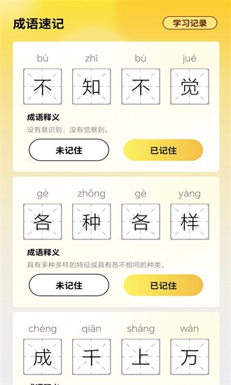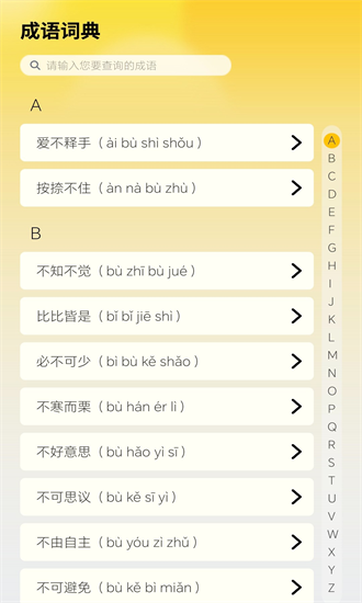 3、软件特别注重实用性,提供成语误用警示、常见搭配建议等功能,确保用户能够准确运用成语,避免表达错误,真正提升语言表达能力。