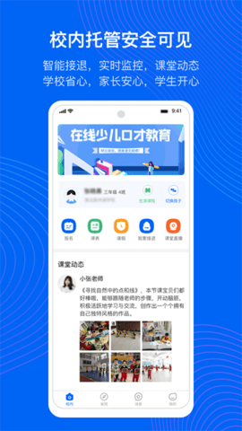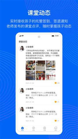 app详细记录孩子在托管期间的各项动态,包括学习表现、饮食情况等。家长可添加多位亲属账号,让爷爷奶奶、外公外婆等家庭成员共同关注孩子的成长点滴。通过这一功能,全家人都能实时了解孩子的托管生活,分享孩子的进步与快乐。
