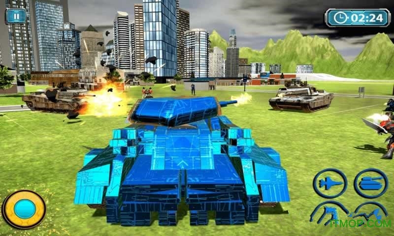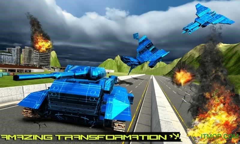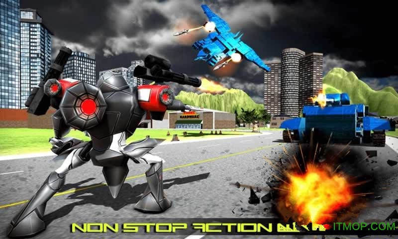 3、在消灭天空的敌人后边变身成为防守稳固的机甲战士守卫城市的和平。游戏独创的"空陆双形态"系统让机器人可以在飞行模式和地面模式间自由切换,应对不同战况。地面模式下机器人将获得更强防御力和近战能力,适合执行城市保卫任务。
