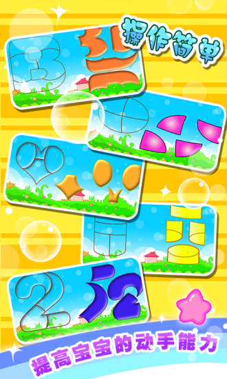 儿童宝宝拼图是一款专为1岁以上婴幼儿设计的益智启蒙游戏。游戏采用生动可爱的卡通画风,通过场景化的拼图玩法,帮助宝宝认识数字、字母、几何图形等基础认知内容。宝宝只需用手指拖拽图片碎片到正确位置即可完成拼图,操作简单有趣。游戏还配有标准发音功能,让宝宝在玩耍中学习发音。自上线以来,这款游戏凭借其寓教于乐的特点获得了众多家长的好评,是培养宝宝认知能力和动手能力的绝佳选择。