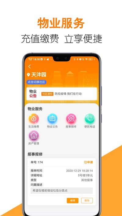 2、整合优质物业服务资源,用户可在线提交报修申请、查询物业公告、预约家政服务等,享受便捷高效的物业生活体验。