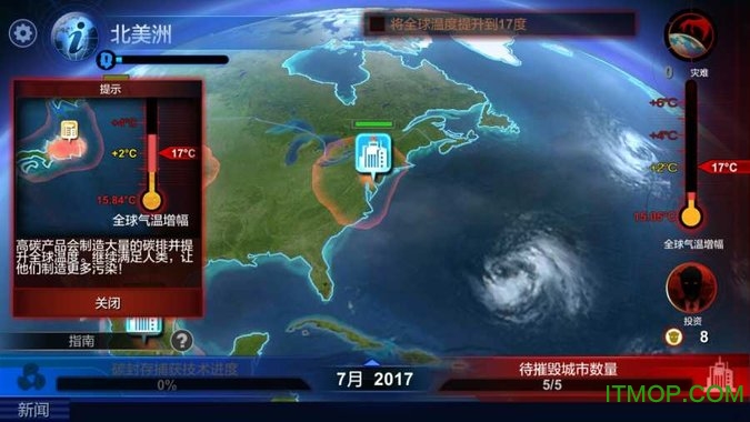 碳战争中文版是一款由GameSourceStudio开发的策略模拟手游,以全球变暖为主题,带给玩家独特的破坏体验。游戏玩法与瘟疫公司类似,但难度更低,题材更贴近现实,操作也更加爽快。玩家将扮演推动碳排放的角色,通过政策调整、工业发展等手段加剧温室效应,最终让地球陷入环境危机。游戏基于真实气候数据开发,在娱乐的同时也能引发玩家对环保问题的思考。精美的3D地球模型和多样化的灾难效果,让破坏过程充满视觉冲击力。