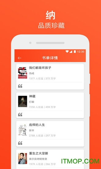 精选分类。根据性别偏好设置男频女频专区,智能推荐热门作品。编辑团队精心策划各类主题书单,解决您的选择困难症。