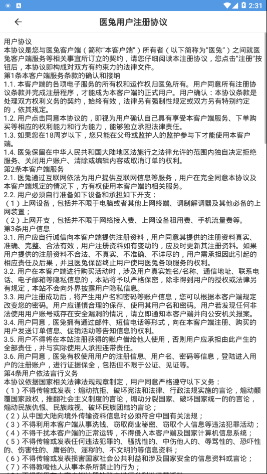 4.医兔信用:为促进医患关系和谐发展,平台建立了完善的信用评价体系。系统会记录医生回复及时性、服务态度等指标,同时也会评估患者咨询行为的规范性。对于存在不文明、不诚信行为的用户,平台将采取相应措施,共同维护良好的医疗咨询环境。