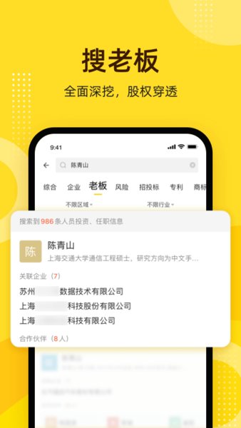 启信宝支持通过企业名称、人名、品牌、联系方式、网址、专利等多种关键字或组合关键字进行多维度查询,精准锁定目标企业。用户可以全方位获取企业工商信息、变更记录、对外投资、企业年报、法院公告、法院判决、失信信息、被执行人、司法拍卖、经营异常、公司新闻、招聘信息、专利信息、商标信息、着作权、软件着作权、域名信息、企业链图、信用报告、公司评价等详细数据,全面了解企业状况。