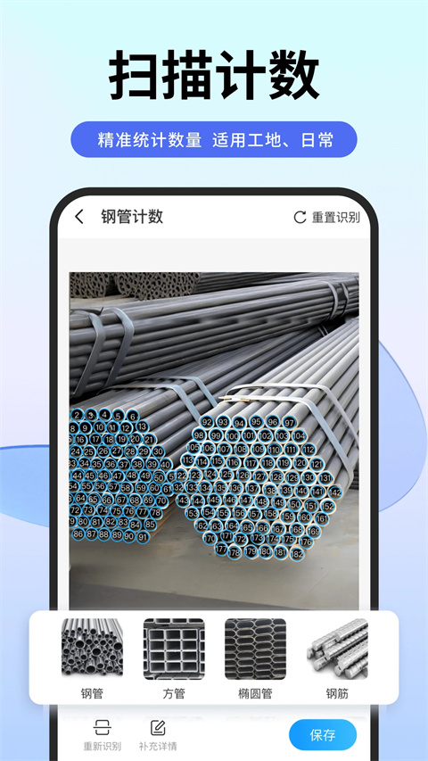 3、高效扫描计数:通过机器学习算法识别各类建材,支持批量处理多张照片,自动生成带时间戳的统计报表。