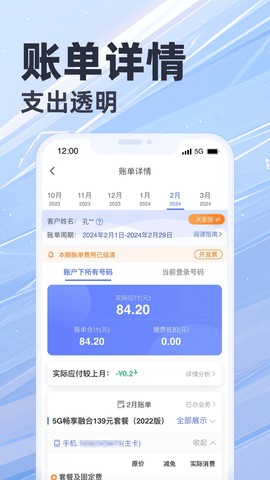 -账单查询全面精准,可实时查看当前话费、历史账单、积分余额、套餐余量等详细信息,数据更新及时,分类清晰,帮助用户掌握消费情况。