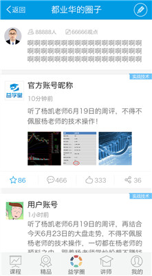 内容具有多样性:财经新闻、讲师心得、学员分享的股市见解。一起加入"都业华、杨凯、匡洺颉、吴剑、朱超"的学习圈,创建你的最热话题,发现股市里的朋友都在关心的事。平台定期举办线上交流活动,邀请知名投资人与用户面对面交流。用户还可以建立自己的投资日志,记录交易心得,与其他投资者互动讨论。