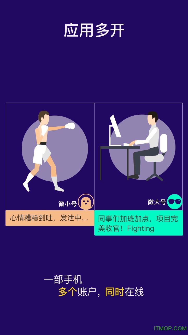 全球首款双开类APP,轻松免费实现微信双开,微信多开,微信分身:告别多个微信账户来回切换的烦恼;一部手机,多个微信账号同时在线,放肆分享,放肆聊天。多开,开启疯狂的抢钱模式;、探探多开,瞬间获得撩妹技能包;微博、多开,养小号、加好友自由无束;、多开,养小号,自己组团打怪更欢乐;、、等几乎所有应用都可以多开,惊喜总是在意料之外,彻底解决用户的多账户需求。软件还支持自定义通知样式,让用户轻松区分不同账号的消息提醒。