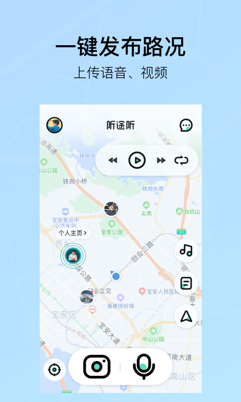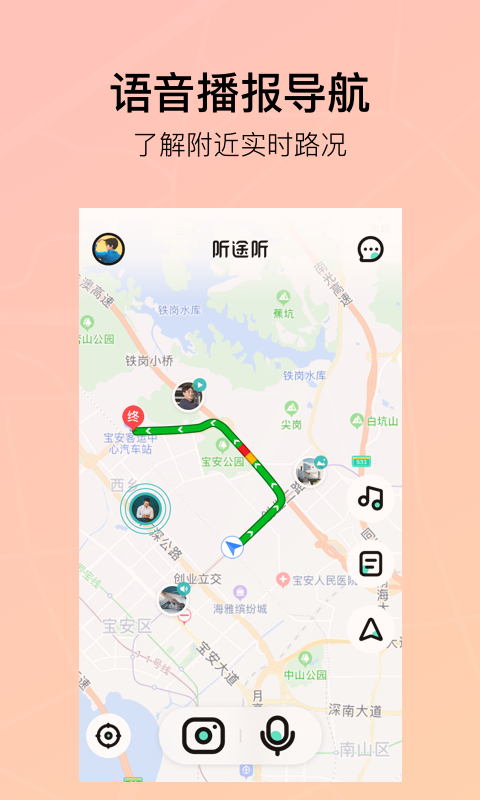 路况爆料:用户可通过现场拍图片、语音等方式爆料周边交通路况,同时您也可以通过听途听接收周边网友所提供的信息爆料。所有爆料内容都会经过AI智能审核和人工复核,确保信息的真实性和时效性。