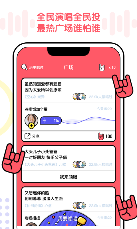 【运气】你能1秒分出谁是歌神谁是音痴吗?快来挑战你的音乐直觉,看看你是否能成为真正的音乐达人。【手速】你能成功抢到歌曲接唱吗?考验你的反应速度,与好友一较高下。【人气】广场人气大,拉票?你行吗!在这里,人气就是王道,看看你是否能赢得大家的喜爱。【实力】手握10张选票,你想pick谁?用你的投票权支持你最喜欢的歌手。【曲库】歌曲or网络热歌,你都会吗?丰富的曲库资源,让你尽情展现自己的音乐才华。无论是经典老歌还是最新热门,这里应有尽有。