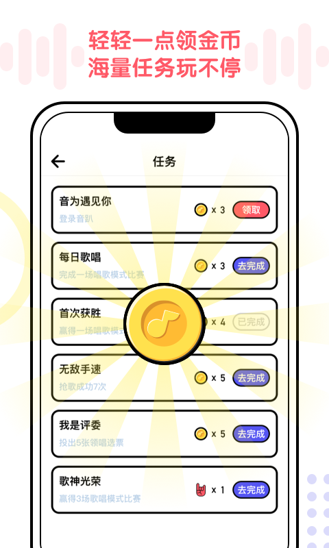 轻轻一点领金币,海量任务玩不停。完成任务即可获得丰厚奖励,让你的音乐之旅更加精彩。魅力榜首我最强,灵魂歌手就是我。在这里,你可以通过实力登上排行榜,成为众人瞩目的焦点。全民演唱全民投,最热广场谁怕谁。与全国各地的音乐爱好者一起PK,看看谁才是真正的歌神。下载音趴APP,开启你的音乐梦想之旅!
