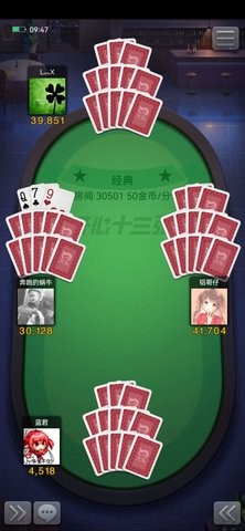 游戏使用标准的52张牌(不含大小王),每位玩家将获得13张牌。这13张牌需要分为三道:头道3张、中道5张和尾道5张。游戏规则要求头道必须小于中道,中道必须小于尾道,否则将被判定为"相公"。牌型大小依次为:五同>同花顺>铁支>葫芦>同花>顺子>三条>两对>对子>乌龙。当同一道的牌型相同时,需要比较点数大小;若点数也相同,则视为大小相同,不比较花色。