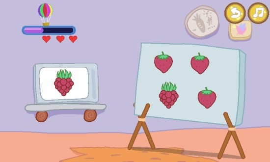 当关卡里面出现一个飞机的时候,玩家就需要在其他4个图案里面找到飞机的图案就可以了。这种分类训练有助于孩子建立物品归类概念。