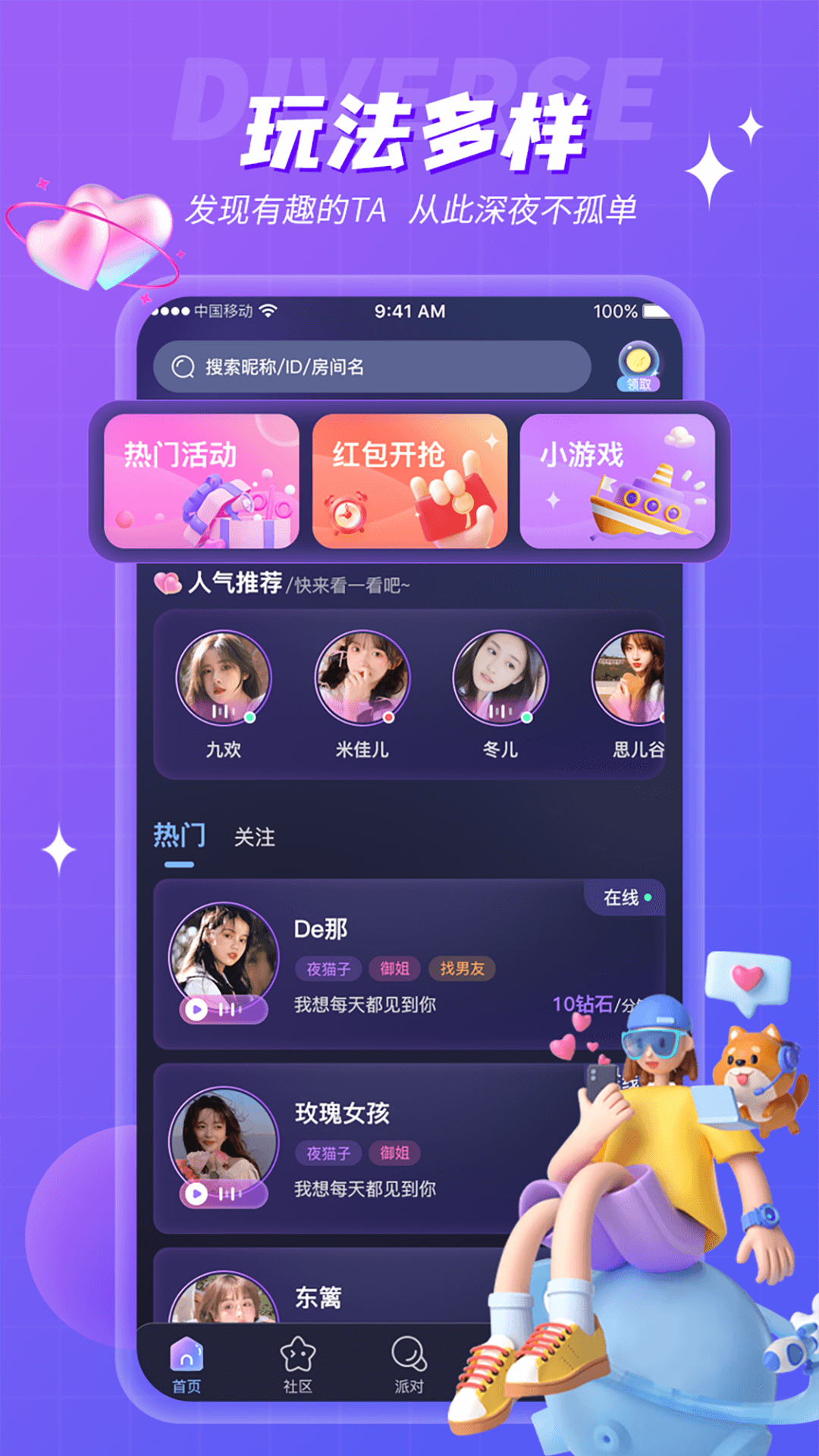 -玩法多样:平台持续更新各类趣味互动功能,从游戏PK到情感电台,总有一款适合你。丰富的社交场景让你轻松找到志同道合的伙伴,告别深夜独处的寂寞时光。