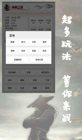 《侠客江湖》是一款以文字为主的武侠题材游戏,延续了经典武侠游戏的玩法精髓。虽然游戏采用文字表现形式,但其丰富的游戏性丝毫不逊色于画面精美的游戏。玩家可以在游戏中体验打怪升级、提升境界、加入门派、学习功法等经典武侠玩法。通过不断的冒险和战斗,玩家可以获得各种强力装备,还能进行多样化的角色养成。游戏特别注重策略性和可玩性,让玩家在文字的世界里也能感受到刀光剑影的江湖气息。无论是剧情党还是战斗党,都能在这款游戏中找到乐趣。