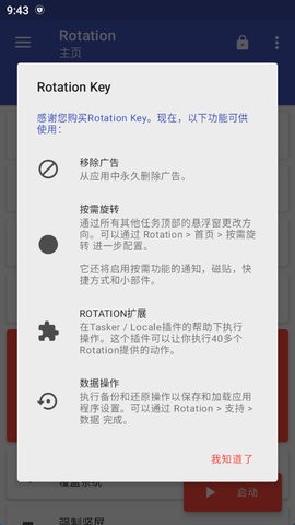 其他开机启动通知振动等。用于执行各种操作的小部件、快捷方式和通知图块。旋转扩展,通过Locale/Tasker插件自动执行40多个操作。支持快速设置以立即配置主要功能。专门的支持部分来解决一般问题。执行备份和恢复操作以保存和加载应用设置。条件通话方向锁定方向耳机方向充电方向基座方向应用方向事件优先级-在两个或多个事件同时发生的情况下可自定义的事件偏好。按需使用支持的任务顶部提供的完全可自定义的浮动头(或通知或磁贴)更改前台应用程序或事件的方向。主题具有背景感知功能的动态主题引擎可避免任何可见性问题。