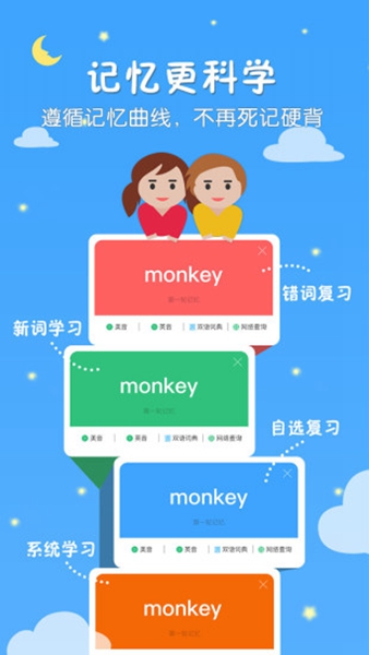 支持语音搜索和拍照取词,生词自动归类到"学校""家庭"等虚拟场景。可导入教材单词表,生成专属学习路径。