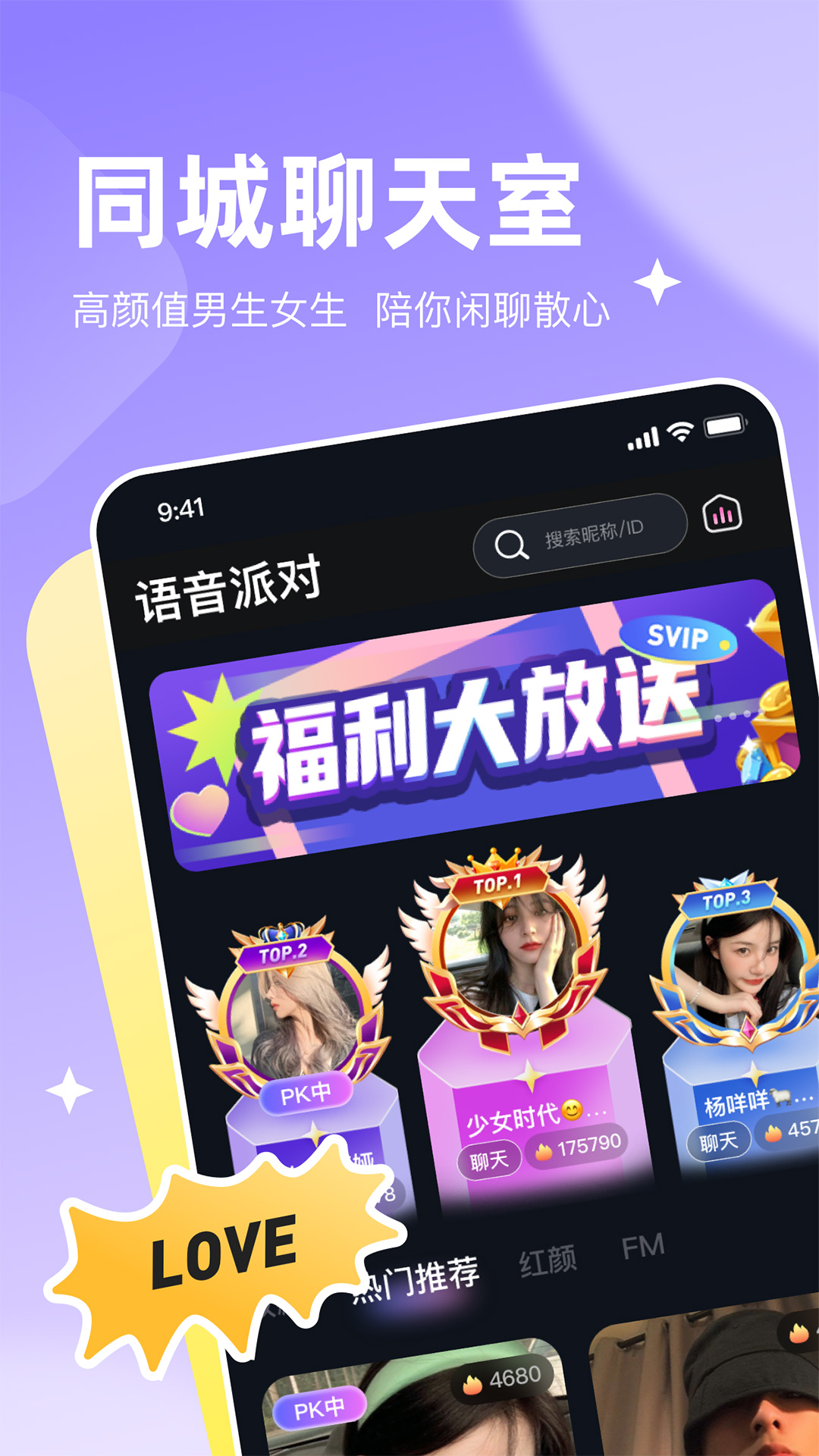 2.在此恋爱社交有趣,享受更多的连麦:应用特别设计了语音连麦功能,用户可以通过实时语音交流建立更亲密的联系,让线上互动更具真实感和温度。