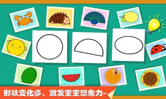 小小手指点一点,形状瞬间就变身!圆形、半圆形、椭圆形竟然可以变幻出这么多可爱的小精灵!害羞的小饼干、顽皮的小刺猬、香甜的大西瓜,小朋友,快瞧瞧你画出了什么呀!唱歌的喷头、变魔术的火龙果、还有勤劳的蜜蜂!点击屏幕,来邀请小动物们一起玩耍吧。1.5岁以上的宝宝对图形充满好奇,通过点点形状,变出各式各样的图案,提升宝宝对图形的辨识度,激发宝宝对画画的兴趣。游戏采用渐进式学习模式,从简单的图形认知开始,逐步引导宝宝完成更复杂的绘画创作,让每个孩子都能在游戏中获得成就感。精心设计的互动场景和生动音效,让学习过程充满欢乐,帮助宝宝建立对绘画的持久兴趣。