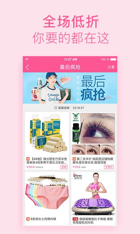 3、价格低(打造一折清仓和半价封顶特价模块)。与各大品牌深度合作,争取最大优惠力度。每日特价专场、限时秒杀、品牌折扣等活动轮番上演,让你以最低价格买到心仪商品。