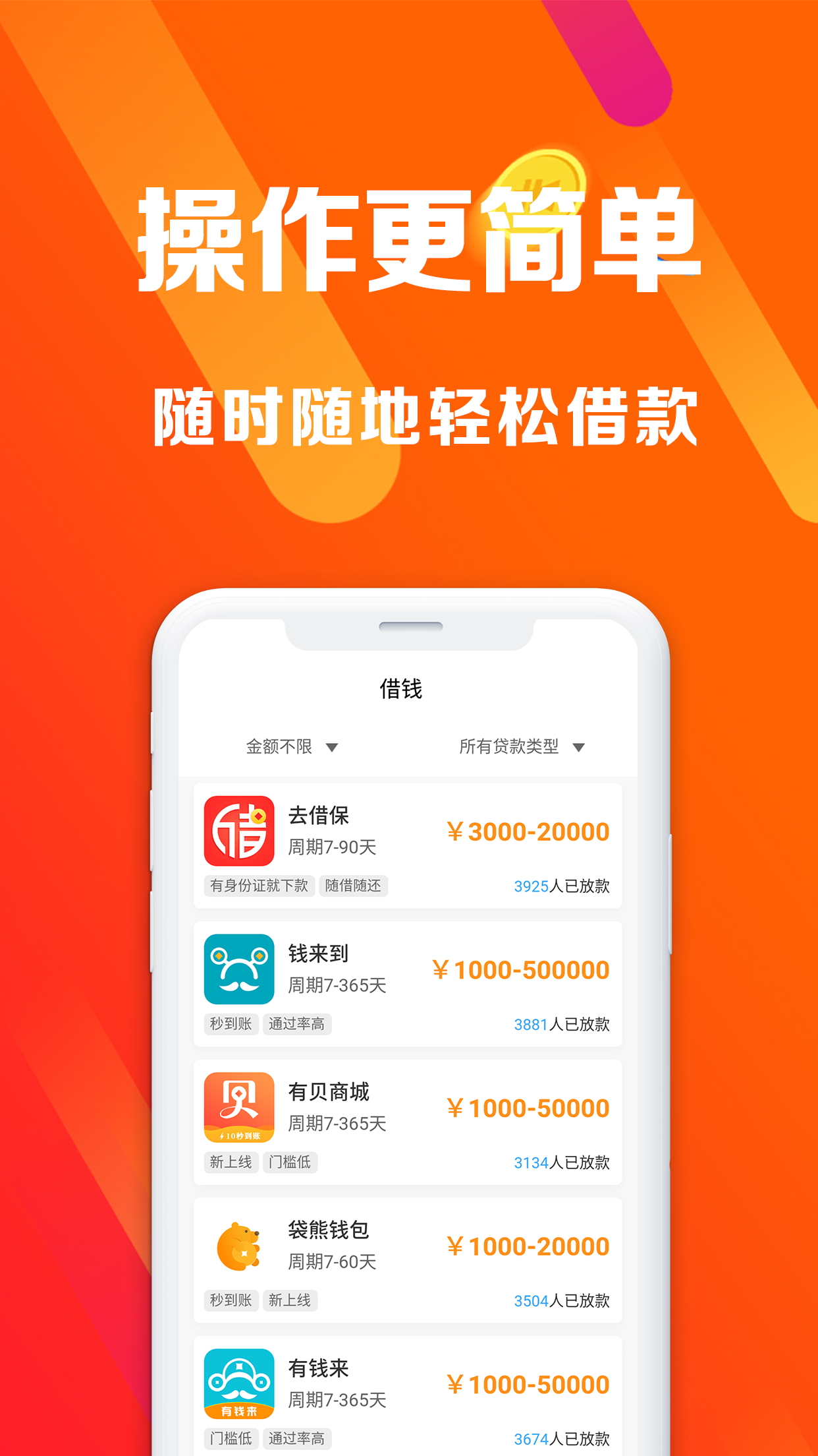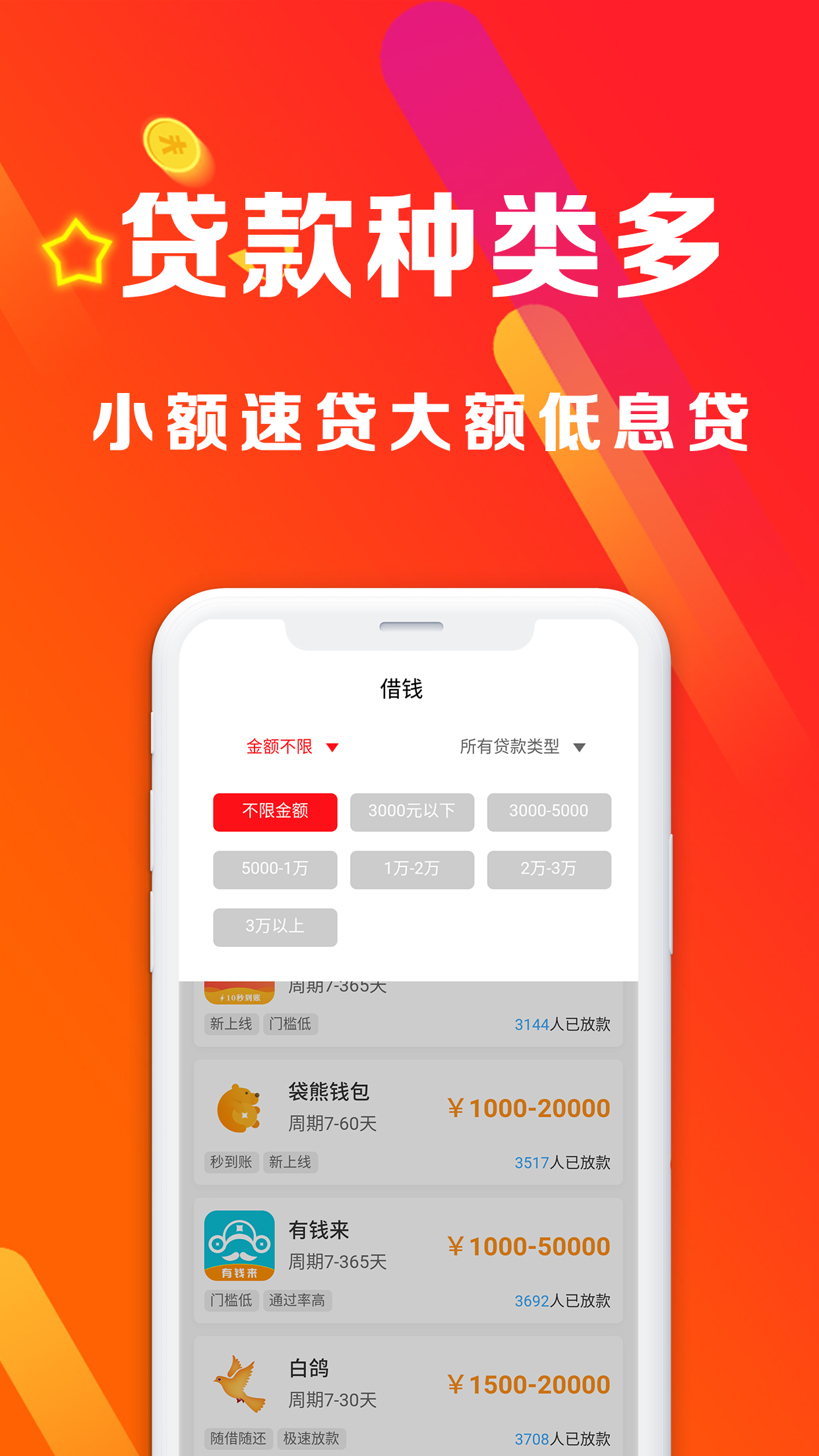 【全面解决】:个人消费贷、企业经营贷、车房装修贷、出行旅游贷、学习进修贷、投资贷。平台覆盖各类生活场景的资金需求,从几千元的小额应急到几十万元的经营周转,都能找到合适的产品。针对不同用户群体设计差异化方案,满足多元化借款需求。
