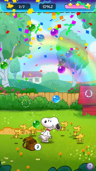 玩过泡泡龙的朋友对这款游戏肯定不会陌生,史努比泡泡中玩家只需要凭借辅助线来将史努比手中的泡泡投掷出,与上方同色泡泡相同,且在3个或3个以上即可完成消除,而由于小鸟被尘封于泡泡之中,所以消除后即可拯救小鸟,但由于每个关卡都有目标限制,且需要在限定的步数内完成,步数越少,消除积分越多即可荣登世界排行哦。