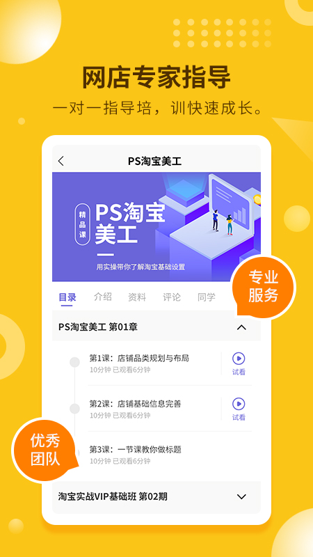 1、为网店卖家提供先进有效的培训教程,解决如何开网店问题。课程内容涵盖市场分析、选品策略、视觉设计、客服话术等全方位知识,通过案例教学+实战演练的方式,帮助卖家快速掌握核心技能;