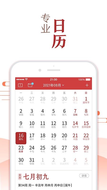 8、完整的黄历、忌讳、吉时、吉日、辟邪、二十八星座、十二建星、彭祖百吉、生肖、冥日,是你了解中国传统黄历的必备工具。特别设计的黄历解读功能,用通俗易懂的语言解释专业术语,让传统文化更接地气。