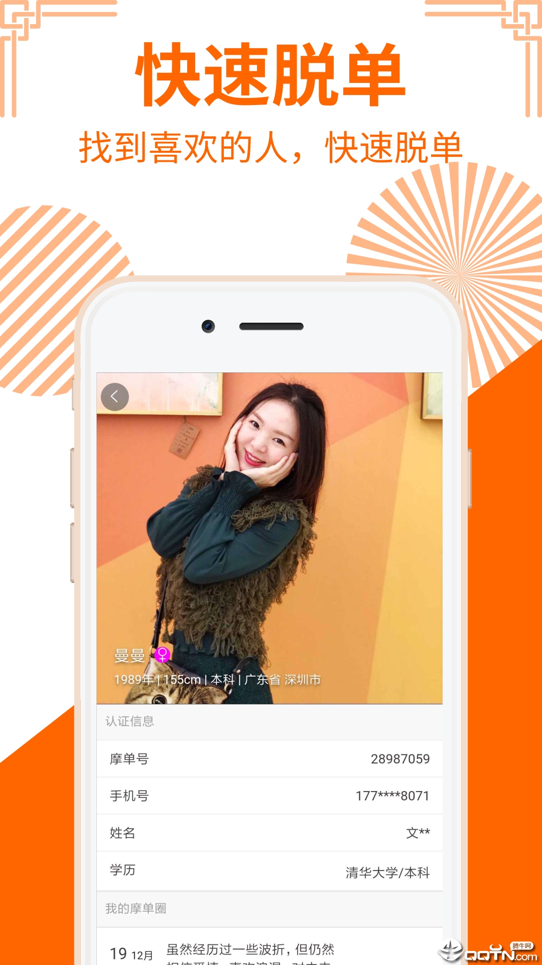 2、快速脱单:摩单单身设计了简洁直观的聊天界面,让您能够直接向心仪对象表达好感。平台还提供智能匹配功能,根据您的兴趣爱好和择偶标准推荐合适的对象,大大提高了交友效率,帮助您更快找到理想的另一半。