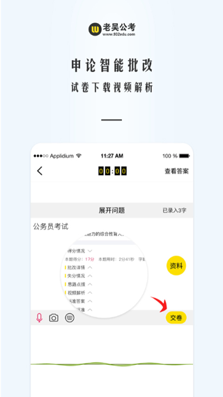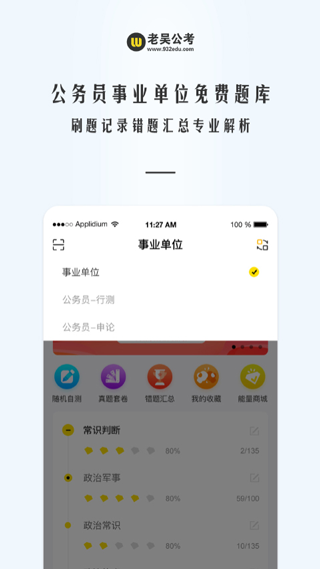 老吴公考APP是一款专为公务员考生打造的专业备考软件,致力于提供全面、高效的学习辅导服务。该软件整合了官方优质教学资源与移动端便捷特性,覆盖申论、行测、面试等核心考试科目,形成一站式备考解决方案。用户可根据个人需求自由选择课程、资料及名师直播课,支持离线缓存功能,随时随地学习。此外,APP还提供最新公考资讯和在线互动交流平台,帮助考生掌握考情动态,与名师零距离沟通,让备考过程更加轻松高效。
