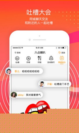 2、吐槽大会:同城聊天交友,和附近的人一起吐槽。在这里,你可以尽情分享生活中的趣事或烦恼,与附近的朋友一起交流互动。