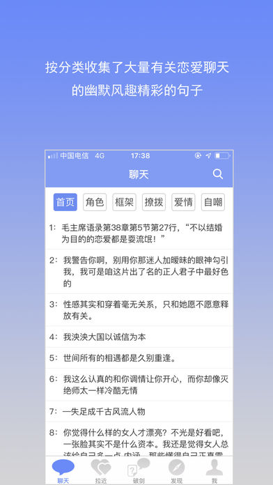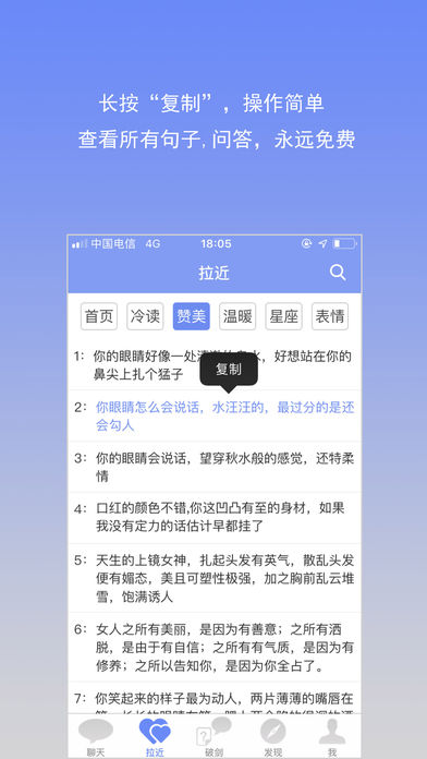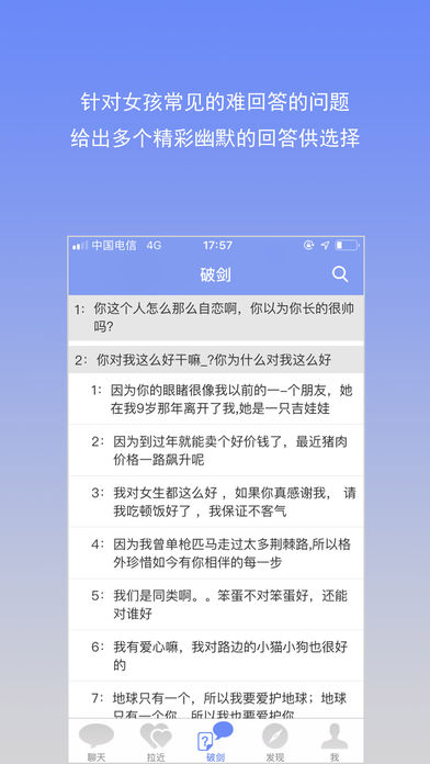 1.智能分类整理3000+高频恋爱金句,涵盖赞美、调侃、关心等8种表达类型,支持语音朗读练习;2.针对50种常见"送命题"设计双版本应答方案,既保持幽默又不失分寸,附带话术使用情景说明;3.独创的一键转发功能,自动适配主流社交平台格式,支持话术二次编辑和收藏夹分组管理;4.进阶搜索支持"模糊查询+场景筛选"双模式,可快速定位适合特定关系的应答策略,并记录常用话术。