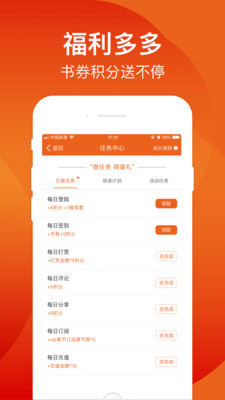 4.任务中心福利多,做任务升等级赢书券。每日签到、阅读时长、书评互动等任务可获得丰厚奖励,积累的书券可兑换付费章节。
