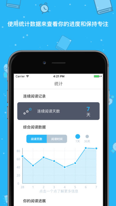 洞悉海量阅读数据:总阅读时间、总阅读页数、阅读速度、每日阅读时间等:专业的数据分析模块可以生成周报、月报和年报,帮助你发现阅读习惯中的优点和不足。