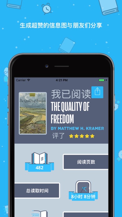 为你阅读的每一本书生成非凡的信息图表:独特的可视化功能可以将阅读数据转化为精美的图表,支持分享到社交平台,与好友一起交流阅读心得。